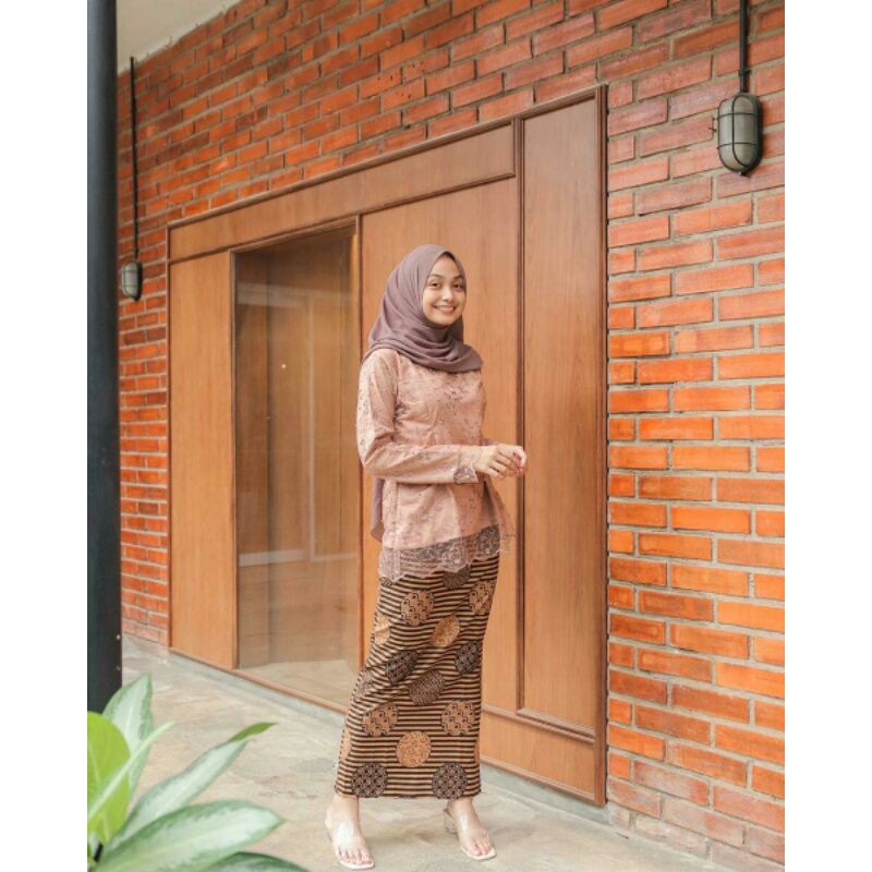 Name: Real Pict Kebaya Setelan Kebaya Brokat Aurora Mix Rok Plislet Warna Mocca Gold Abu Dongker Estetika